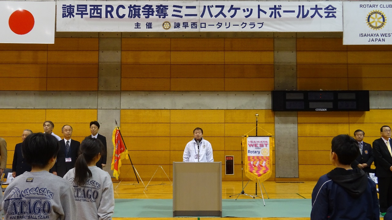 結びに、本大会の開催にあたり多大なるご尽力をいただきました、諫早西ロータリークラブ並びに諫早市ミニバスケットボール連盟の皆様に深く感謝を申し上げますとともに、本大会の御盛会と選手の皆様の御健闘を祈念いたしまして、お祝いのことばといたします。
