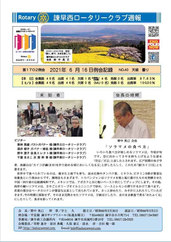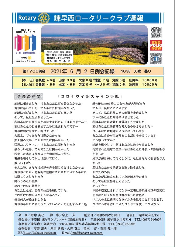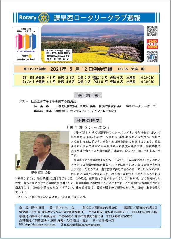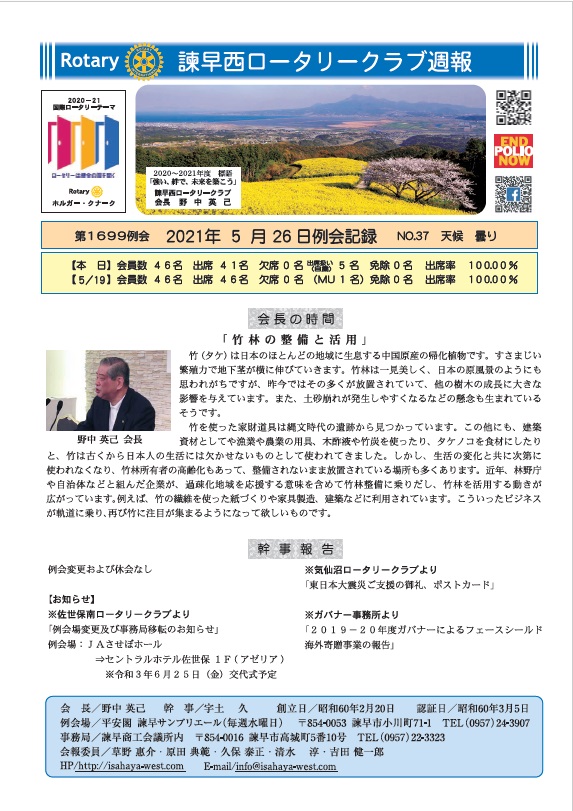 2021-2022年度 毎熊正太郎 会長 5月18日 5月25日 6月8日 1739 4月13日 4月20日 4月27日 5月11日 3月16日 3月23日 3月30日 4月6日 12月22日 1月12日 1月19日 3月9日 11月24日 12月1日 12月8日 12月15日 10月20日 10月27日 11月10日 11月17日 9月22日 9月29日 10月6日 10月13日 8月4日 8月11日 8月18日 9月15日 7月7日 7月14日 7月21日 7月28日 2020-2021年度 野中英巳 会長 5月26日 6月2日 6月9日 6月16日 4月21日 4月28日 5月12日 5月19日 3月24日 3月31日 4月7日 4月14日 2月17日 2月24日 3月3日 3月10日 12月23日 1月13日 1月20日 2月10日 11月25日 12月2日 12月9日 12月16日 10月28日 11月4日 11月11日 11月18日 9月30日 10月7日 10月14日 10月21日 9月2日 9月9日 9月16日 9月23日 7月1日 7月8日 7月15日 7月22日 2019-2020年度 木村暢義・久保泰正 会長 6月3日 6月10日 6月17日 6月24日 2月26日 3月4日 3/25 4月1日 1月29日 2月5日 2月12日 2月19日 12月25日 1月8日 1月15日 1月22日 11月27日 12月4日 12月11日 12月18日 10月9日 10月23日 10月30日 11月6日 9月11日 9月18日 9月25日 10月2日 8月7日 8月21日 8月28日 9月4日 7月3日 7月10日 7月24日 7月31日 2018-2019年度 草野惠介 会長 6月12日 6月19日 6月26日 5月15日 5月22日 5月29日 6月5日 4月10日 4月17日 4月24日 5月8日 3月6日 3月13日 3月27日 4月3日 2月6日 2月13日 2月20日 2月27日 1月9日 1月16日 1月23日 1月30日 12月5日 12月12日 12月19日 12月26日 11月6日 11月14日 11月21日 11月28日 10月3日 10月10日 10月24日 10月31日 9月5日 9月12日 9月19日 9月26日 8月1日 8月8日 8月22日 8月29日 7月4日 7月11日 7月18日 7月25日 2017-2018年度 塚原浩三 会長 6月27日 5月30日 6月6日 6月13日 6月20日 4月25日 5月9日 5月16日 5月23日 3月28日 4月4日 4月11日 4月18日 2月21日 2月28日 3月7日 3月14日 1月24日 1月31日 2月7日 2月14日 12月13日 12月20日 12月27日 1月17日 11月8日 11月15日 11月22日 12月6日 10月11日 10月18日 10月25日 11月1日 9月13日 9月20日 9月27日 10月4日 8月2日 8月9日 8月23日 9月6日 7月5日 7月12日 7月19日 7月26日 FacebooktwitterHatenaPocketCopy